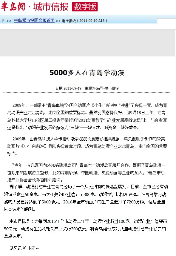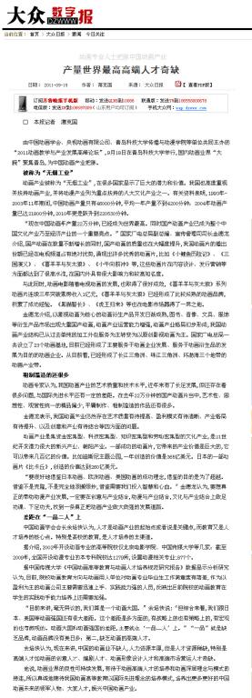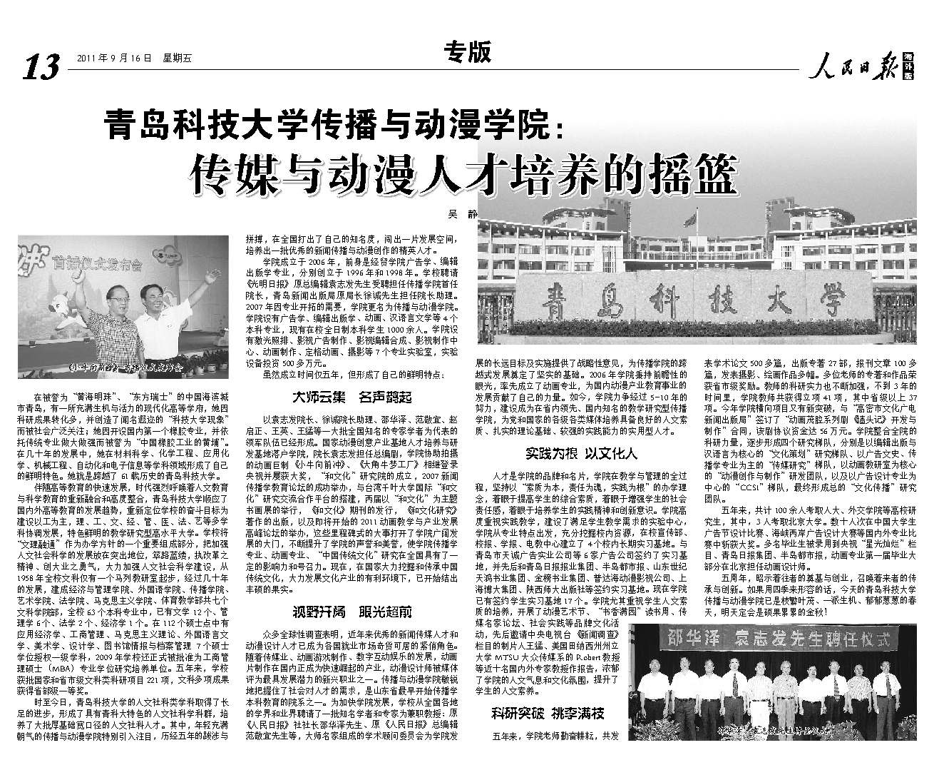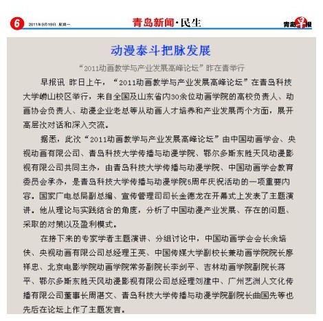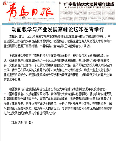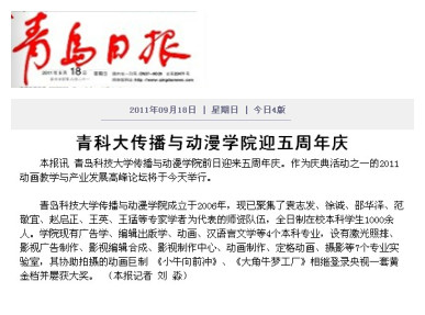 日前,在我校传播与动漫学院成立五周年之际,国家、省市各级媒体纷纷将目光聚焦这所年轻而充满朝气的学院。《人民日报(海外版)》对该学院的办学历程、培养特色、发展成就等方面进行了深度采访和整版报道。在举办动画教学与产业发展高峰论坛当天,大众日报、齐鲁晚报、山东电视台、青岛电视台、青岛日报、青岛早报等十余家媒体记者莅校,做了大量采访报道工作,人民网、新华网、中新网、网易、新浪、搜狐等网媒和海外诸多华文媒体也大量转载报道。