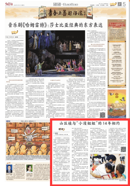9月8日,中国青年报2023年09月08日05版以《山区娃与“小漫姐姐”的14年相约》为题,报道我院“小漫姐姐”爱心支教团连续14年爱心接力的事迹,引起关注和好评。