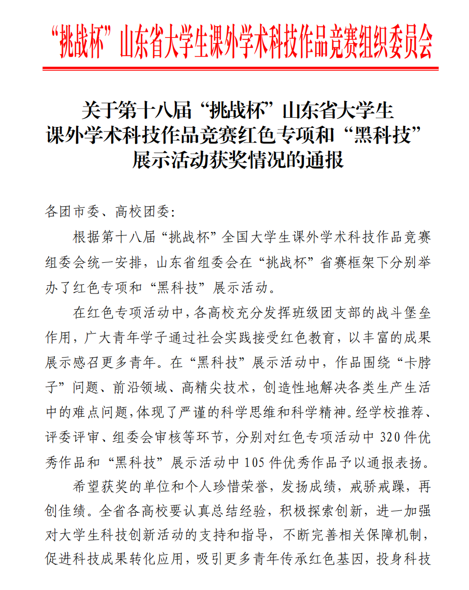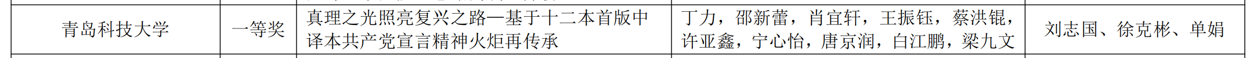 近日,第十八届“挑战杯”山东省大学生课外学术科技作品竞赛红色专项赛山东省省赛落下帷幕,由我院刘志国、徐克彬、单娟老师指导的《真理之光照亮复兴之路——基于十二本首版中译本共产党宣言精神火炬再传承》项目在比赛中脱颖而出,荣获山东省第十八届“挑战杯”红色专项一等奖,实现新突破!