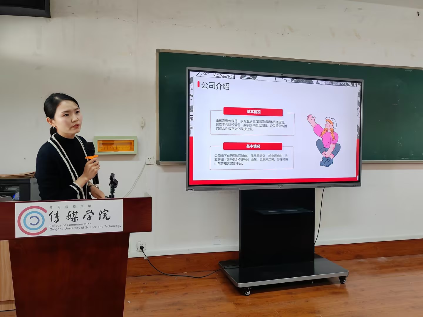 宣讲环节,山东澎聚传媒运营总监田悦锦、人力资源部孙悦通过播放短视频、PPT展示、答疑交流等方式向学院本科、硕士毕业生介绍了澎聚传媒公司概况、校招岗位、职业发展、福利待遇及校招流程等,详细了解与会毕业生需求,并针对相关问题进行答疑解惑。宣讲结束后,同学纷纷投递简历,并与企业负责人进行深入交流。