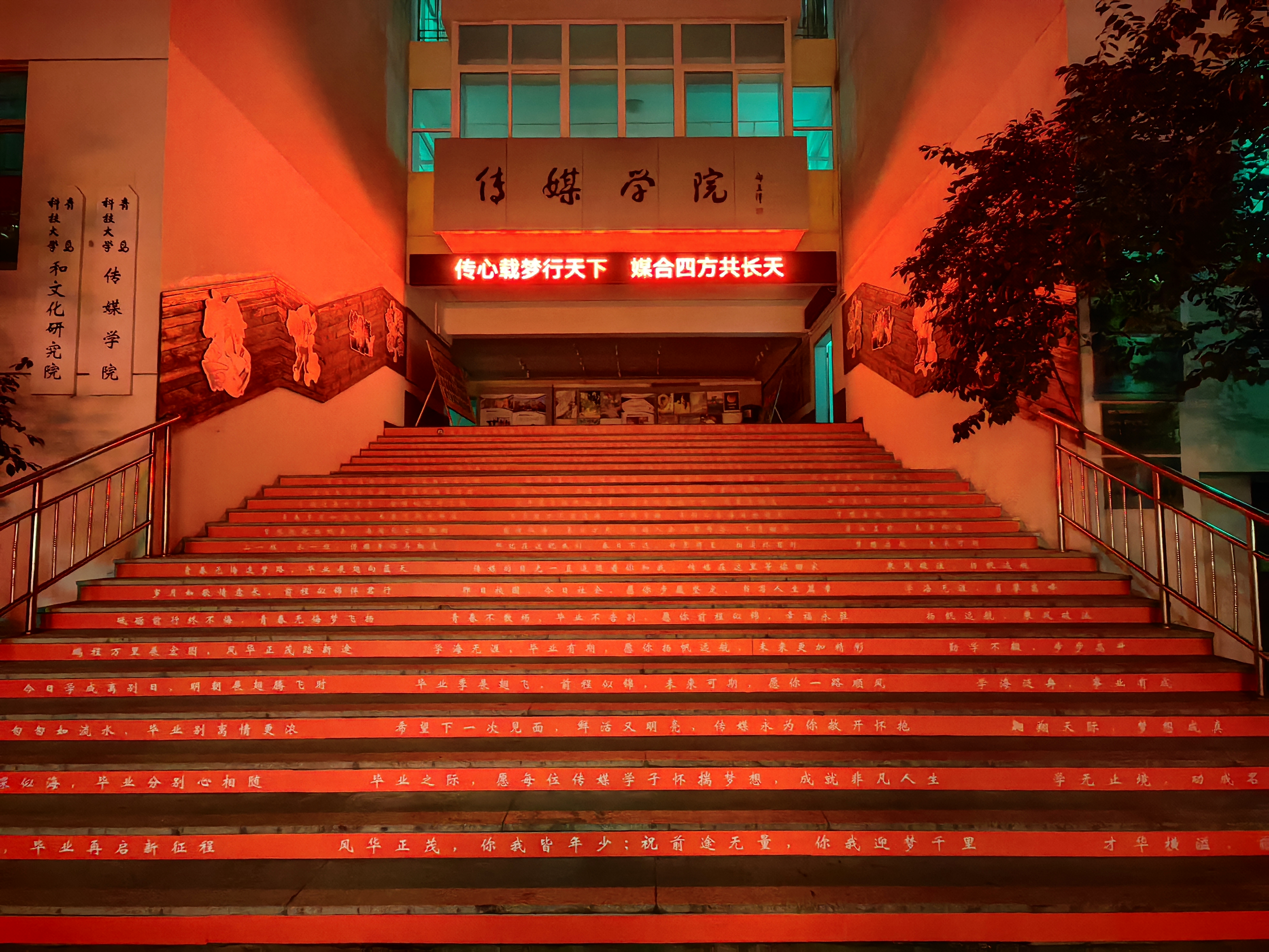 二是布置多重元素,精心营造毕业氛围。学院在门口电子屏设置祝福短语,在台阶处贴满毕业寄语,有专业特色的动漫形象张贴在台阶两侧,考研光荣榜、毕业作品图集等有序陈列,供毕业生打卡、拍照留念,留下属于“传媒”的独家记忆。