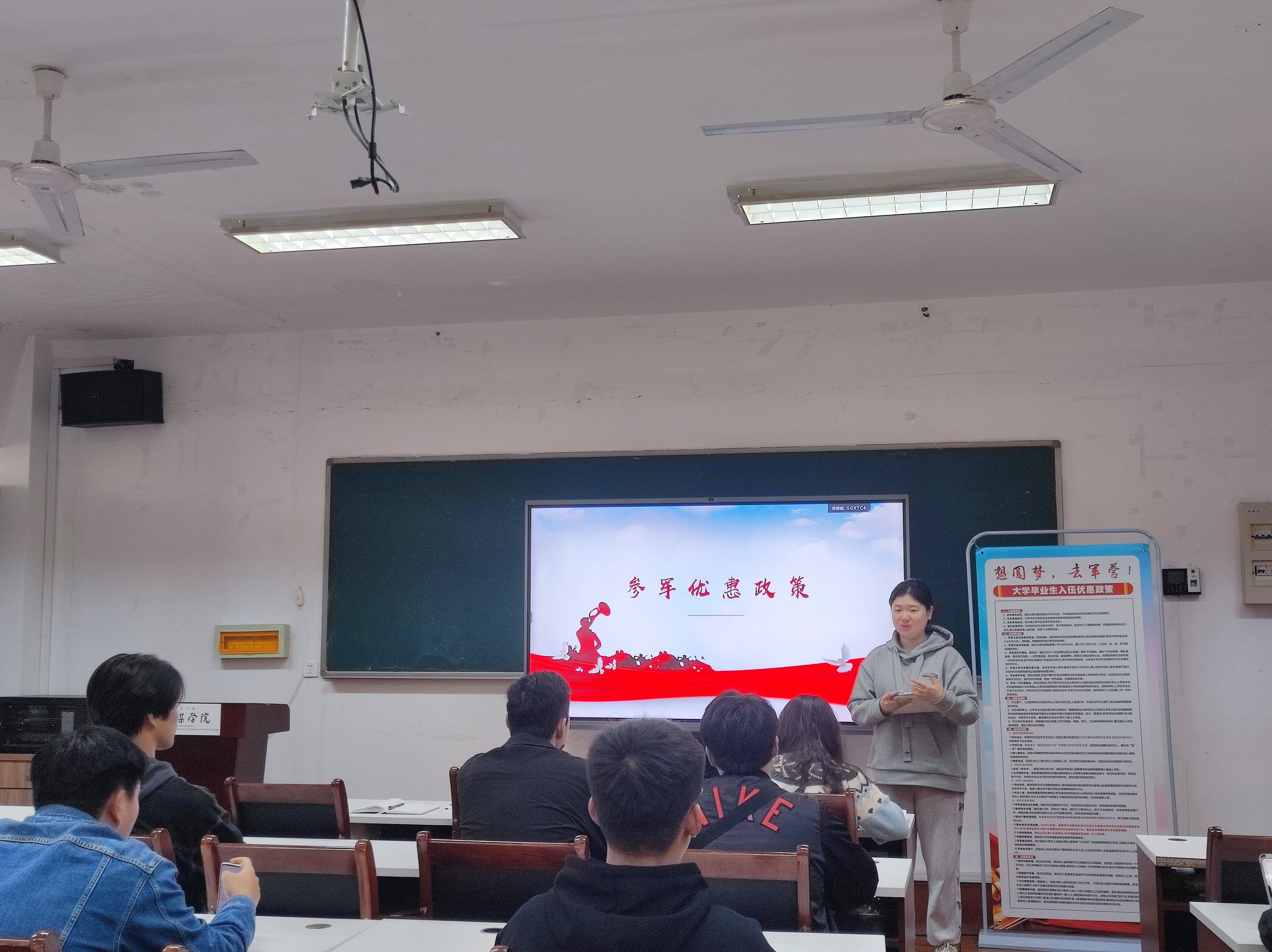 为深入贯彻落实习近平强军思想,宣传国家征兵政策,激发青年大学生参军入伍热情,推动我院大学生征兵工作提质增效,10月30日下午,yl6776永利集团于310会议室举办“青春戎装梦 热血铸军魂”为主题的征兵入伍宣讲会。yl6776永利集团团委副书记兼学工办副主任金莹莹、2022级退役大学生士兵代表王雨璇参加本次宣讲会。